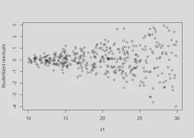 plot(x1, rstudent(m1), ylab = 'Studentized residuals') #classic fan spread of residuals